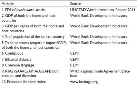 The study incorporates RTA dummy variables to examine the investment creation (intra-bloc investment) impact of three significant RTAs in the region of South, East and South-east Asia, namely, SAARC, APTA and ASEAN. RTAs bring a strong economic bond between the member nations which stimulates a liberal environment, mutual compatible policies and favourable treatment. This supports not only trade but also investment among member nations. The study includes three RTA dummy variables to examine the impact of SAARC, APTA and ASEAN trading blocs, namely, SAARCinvtcr, APTAinvtcr and ASEANinvtcr. The value of the variables is 1 in case both the home and host countries are part of the regional bloc for the given year t, otherwise 0. We expect the coefficient of the variable to have a positive impact on the investment flow in the region.
