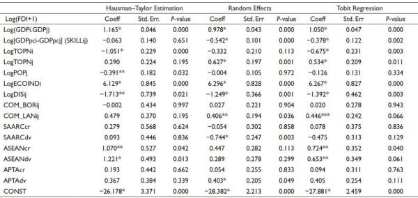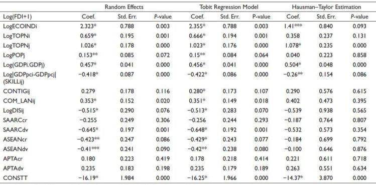 The results for time-invariant variable, distance, are found to be negative and significant. This suggests with lesser distance more flow of investment and, hence supporting vertical FDI. The results for a common border are found to be insignificant. The results for common language suggest more investment slide among nations that have linguistic proximity. The results for variables of our interest, three regional trading bloc (SAARC/APTA/ASEAN) variables are not uniform. The results for intra-SAARC investment creation were found to be positive but insignificant. The results depict that SAARC trading bloc is just facilitating investment among member nations and not a major determinant of investment. The results for SAARC investment diversion are also found to be insignificant. As the sample size for home countries was capturing economies in the Asian region, results for SAARC creation and diversion indicate that SAARC countries do not receive a major share of its investment from Asian economies. The results for ASEAN investment creation and ASEAN investment diversion were found to be quite encouraging. Both ASEAN investment creation and ASEAN investment diversion were found to be positive and significant. This indicates that ASEAN economies are receiving investment both from ASEAN as well as non-ASEAN economies. The results for APTA investment creation were found to be positive but insignificant. The results for APTA investment diversion are found to be positive and insignificant for HT estimation but nearer to significant under the Tobit model (and significant for RE). The results for APTA suggest that intra-APTA investment movement is not significant (just a promoter) but APTA countries are getting investments from other Asian home economies.