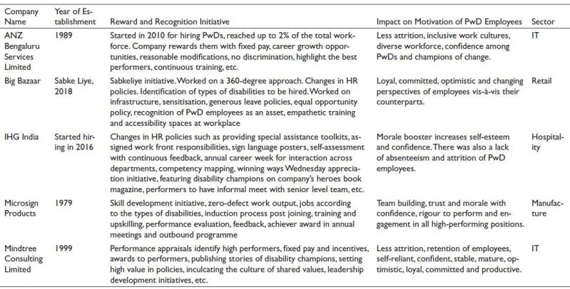 Selected business cases of HPWP that have built the reward and recognition policies to motivate differently abled employees are presented in Table 1.