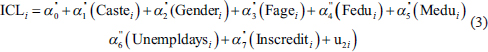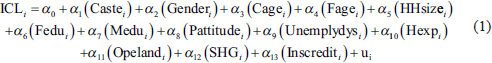 13. Accessibility of institutional credit of the ith households (Inscrediti): Less accessibility to formal loans could be a critical factor in the prevalence of hidden child labour. Due to restrictions of collateral, poor families are unable to receive institutional credit, which is a constraint either to invest in making any income opportunities or to offset any income shocks that may enhance children’s domestic responsibilities (Beegle et al., 2003; Ranjan, 2001).