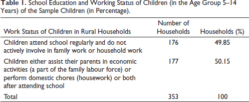 Table 1 presents the distribution of 353 sample children concerning their education and work status within their households. These children are divided into two categories, as mentioned in the table. We primarily focus on the second category of rural households, where 177 school-aged children are identified as ‘Hidden Child Labour’. They assist other earning members of the family in economic activities and/or performing domestic activities to support their mothers each day beyond school hours. Among these 177 ‘Hidden Child Labourers’, 98 are boys and 79 are girls. Field surveys revealed that both boys and girls in this category devote at least 2–3 hours (outside their school hours) to domestic chores or other income-generating activities for the economic benefit of their families.