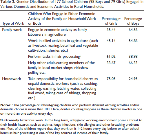 Generally, two types of hidden forms of child labourers are observed in poor households: (a) in family work, where children are involved mainly in agriculture and family enterprises, and (b) in housework or domestic chores that comprise childcare, cleaning, washing, cooking, carrying water and shopping among others. In these two types of activities, the work carried out by children remains unpaid and underreported (Putnick & Bornstein, 2016; Webbink et al., 2012). This type of ‘hidden form of child labour’ has the most vulnerable and marginalised backgrounds, with children experiencing the risk of deprivation in terms of their well-being and overall development. During income shock or health shock in a family, these domestic child labourers become the principal source of family income for the survival of the household, which then impedes their ability to attend classes and fully participate in school activities including games and sports (Galli, 2001; Ravallion & Wodon, 2000). This article will try to explore which situation and under what circumstances adult family members involve their children in unpaid economic activities within the family. Here ‘Hidden Child Labour’ is defined as a type of child labourer (a) who is directly engaged in a household activity and (b) works as unpaid labour in their family business.