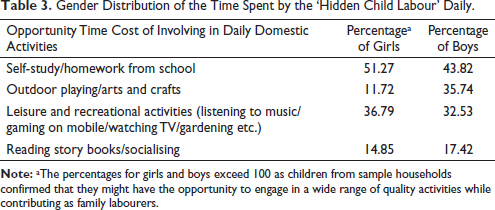 This article is a micro-level study. Though this research objective is still not addressed properly in the Indian context, this type of unpaid child labour is observed among rural households in different parts of India. It is required to investigate whether the parents prefer their girl children to engage in unpaid domestic work over their boys or not. An inter-state comparison can be done in this area because the socio-economic and cultural beliefs among rural people in a patriarchal society like India are different. It can be done using NSSO’s Time Use Survey.