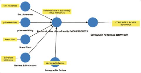 The conceptual model visually illustrates the connections between various elements that affect consumer perception and behaviour towards eco-friendly FMCG products. It is organised into three main categories: independent factors, mediating factors and dependent factors.