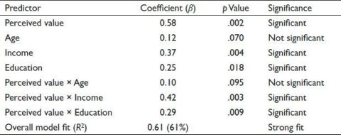 Age is not a significant moderator (p > .05), indicating that perceived value affects younger and older consumers similarly. Since the p value for interaction effects with income and education is < .05, we reject H0 and accept H1.