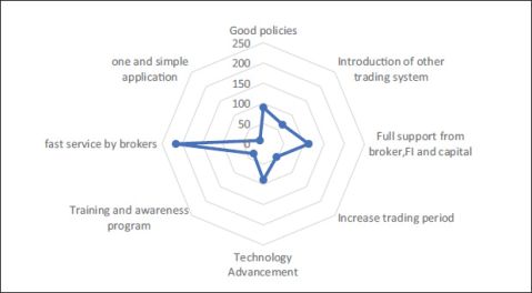 Likewise, the finding documented that large percentage of respondents (95%) suggested to increase the speed of broker, good full support from brokers, FI and capital (50%), making good policies (40%), technology advancement (40%), introducing new trading system like intraday trading, delivery market and so on (30%), increasing the trading days and hours (20%), provide training and awareness program to new traders (15%), and need of one and simple application (50%) (see Figure 3).