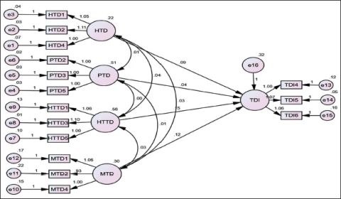 Note: HTD3, HTD5, PTD1, PTD4, HTTD2, HTTD4, MTD3, MTD5, TDI1, TDI2 and TDI3 were excluded after exploratory factor analysis (EFA) due to factor loadings below 0.5.