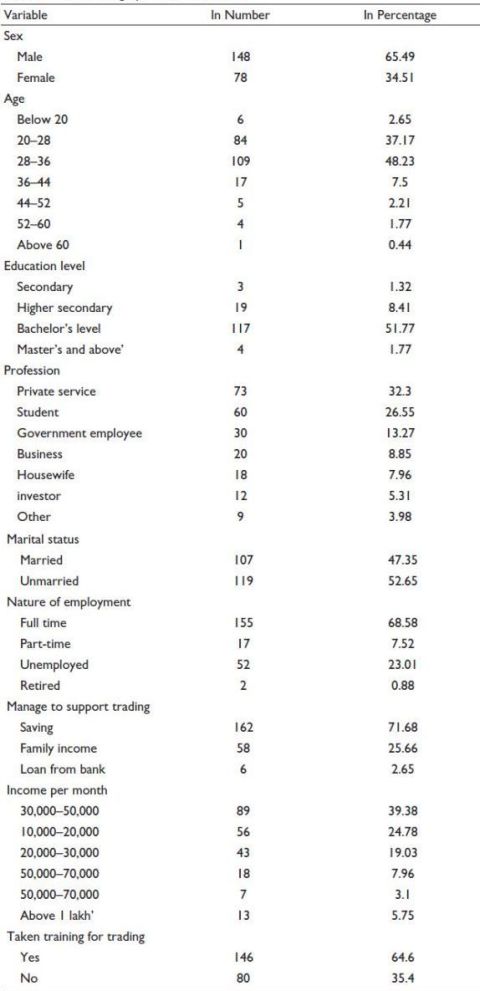 This study adopted a non-probability convenience sampling method due to the lack of a reliable and accessible database of active stock traders in the Kathmandu Valley. Without a clearly defined sampling frame, probabilistic techniques such as random sampling were not feasible. Convenience sampling allowed the researcher to target participants who were actively involved in stock trading and accessible within a limited timeframe and resource scope. The sample size for the study was (266.78 + 13.34) = 280.12 (≈280). However, due to a higher non-response rate, only 226 usable data were collected. While this method enabled practical data collection, it inherently limits the generalisability of the findings, because the sample might not accurately reflect Nepal’s broader investor population.