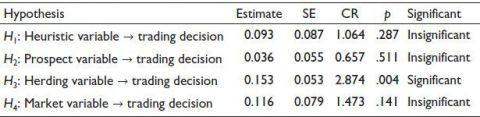 To explore the relationship between behavioural factors and trading decisions, this study employed reliability tests, multiple linear correlation analysis and SEM. The key constructs examined included heuristics, prospect theory, herding behaviour and market factors. Among the proposed hypotheses, only H3 is significant, whereas H1, H2 and H4 are insignificant in this study.